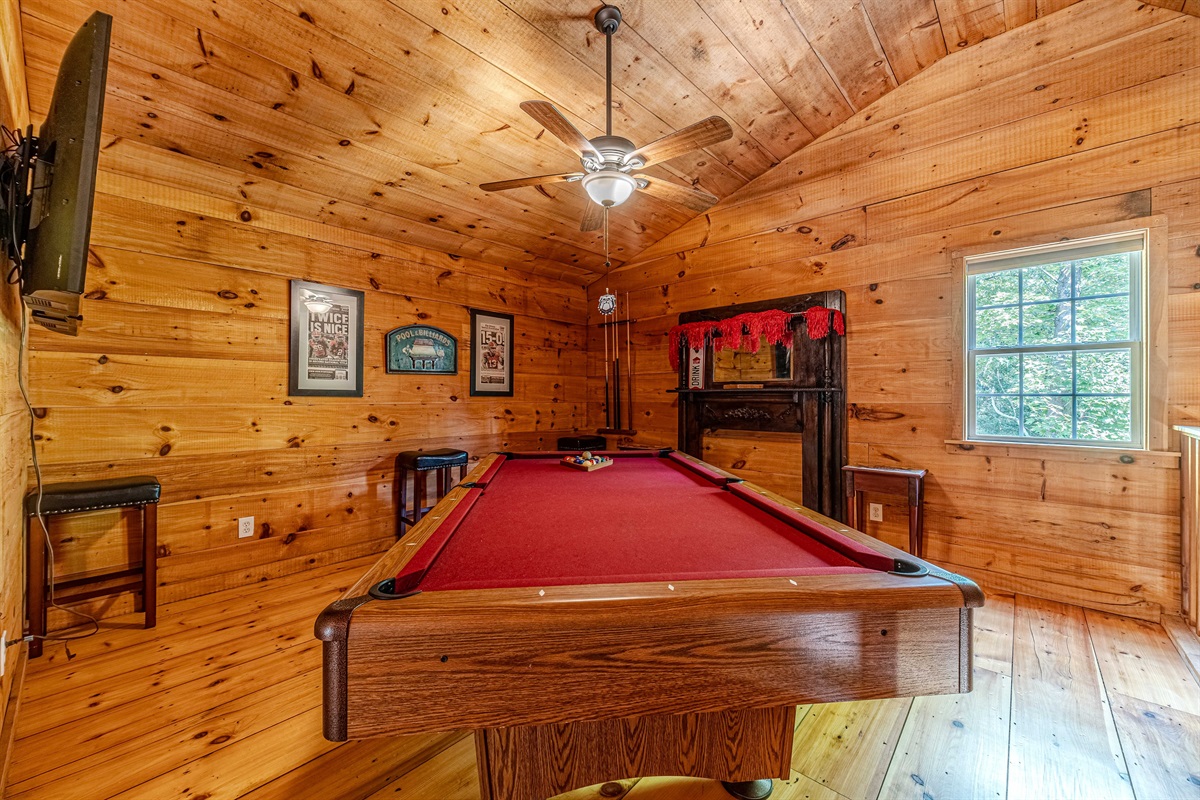 Hoo’s There Hideaway is set up with a beautiful downstairs Master bedroom with a luscious king bed and a great ensuite with Jetted Jacuzzi Tub overlooking the outdoors the full bathroom has a spacious shower. The upstairs bedroom hosts two queen beds with a full bath upstairs and game room loft with FULL-SIZED POOL TABLE! BIG SCREEN SMART TV”S in Living Room, BOTH Bedrooms and Game Room with fiber high speed internet and Rokus on all TVs! Large hot tub on the covered back porch with a beautiful seasonal mountain view and of the manicured landscaping! A wood fireplace to snuggle up to in the living room while enjoying a cup of coffee and a fully stocked kitchen to have everything that you need to prepare a gourmet meal for your family! Also, enjoy the charcoal grill just off the back porch to grill up and smoke your favorite creations!