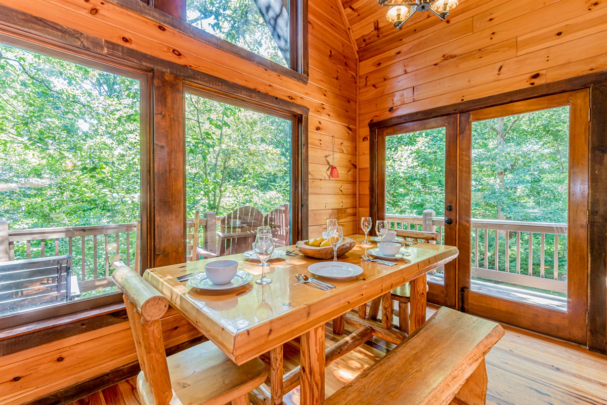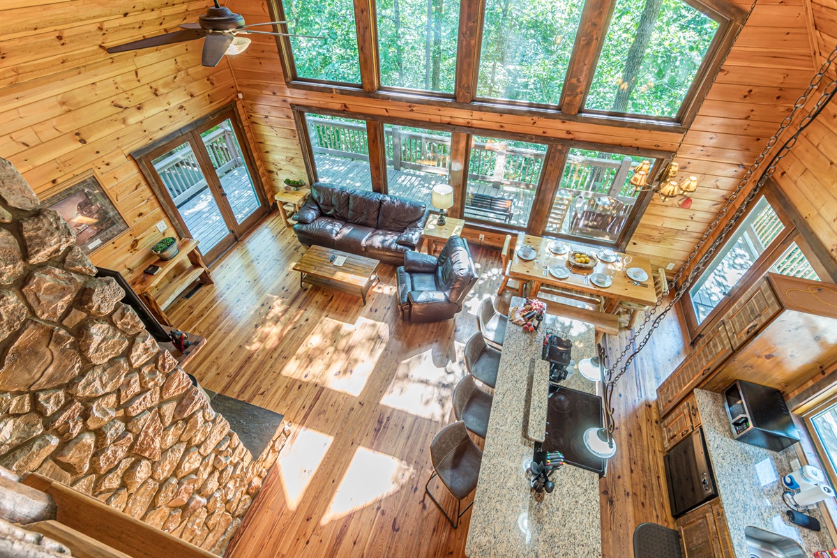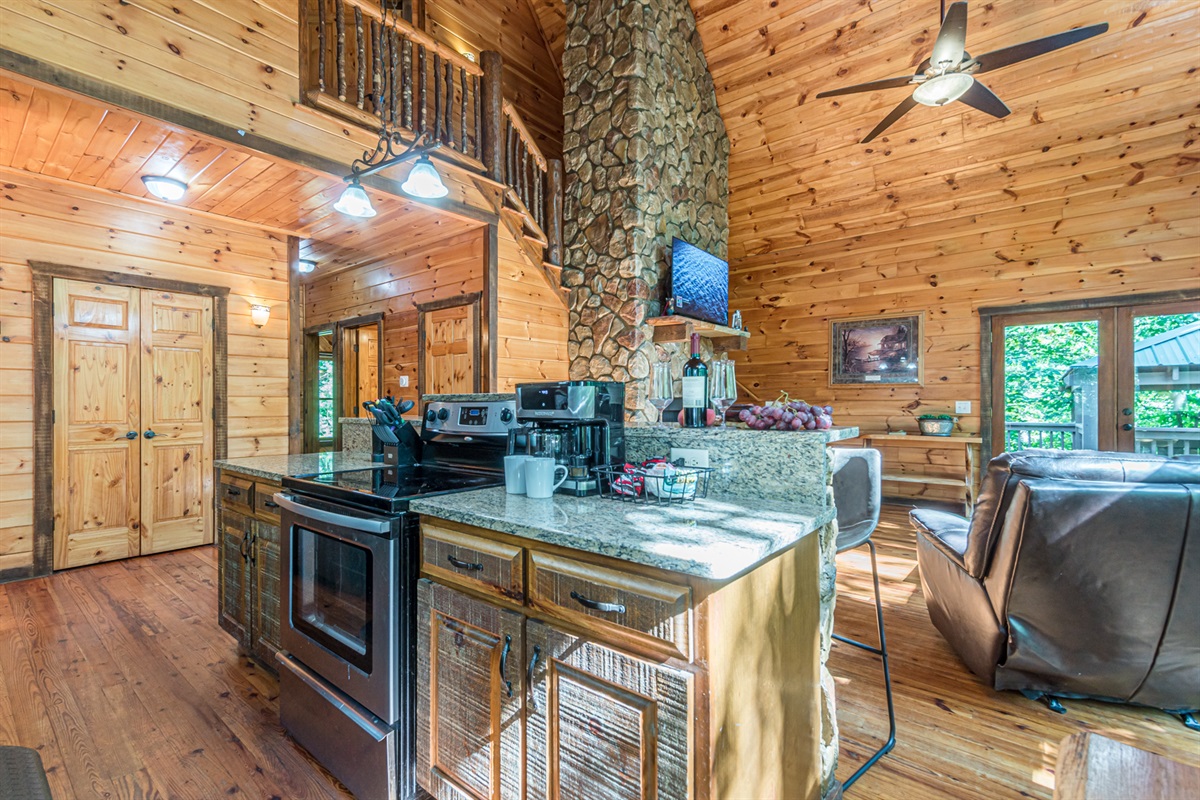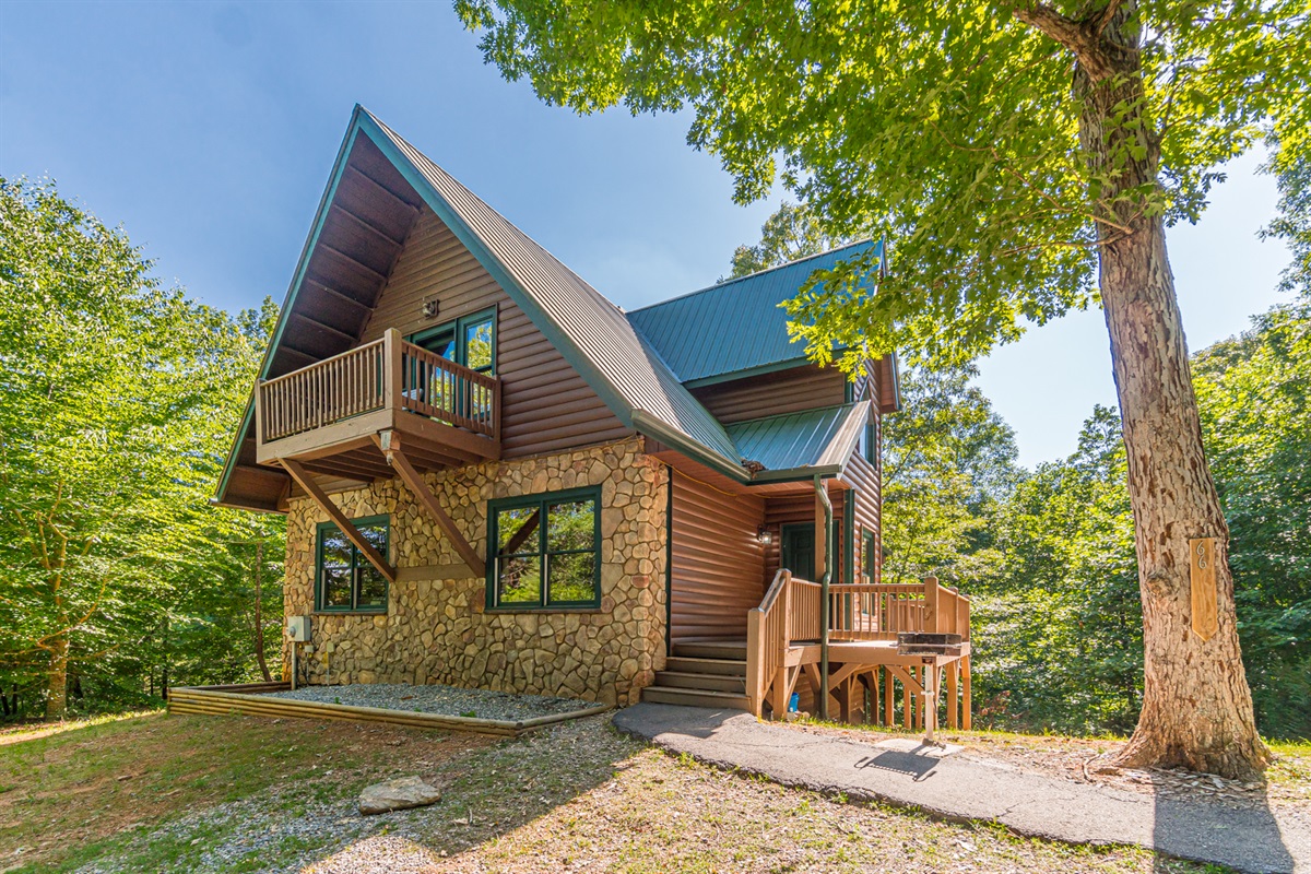 Nestled in a forest of oak trees, this 4 bed, 3 1/2 bath luxury cabin has all the comforts of home in a lush rustic setting. You’ll find that the design is perfect for a romantic getaway or family retreat, with its large cozy rock fireplace that extends to the cathedral ceilings. Oak Hill is stocked with a family playhouse with a full-size slate pool table and 4 player Simpson’s arcade game in the game room and bunks.