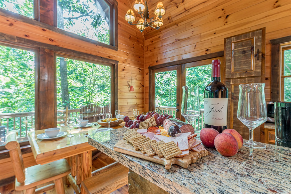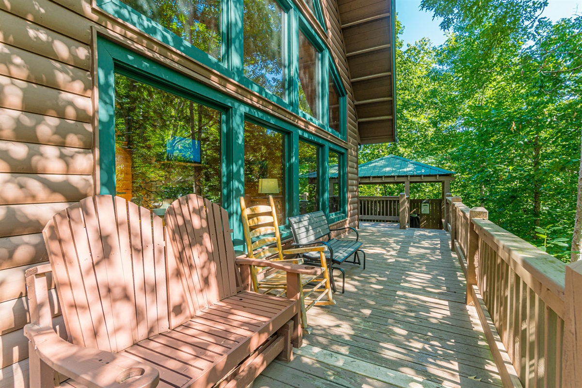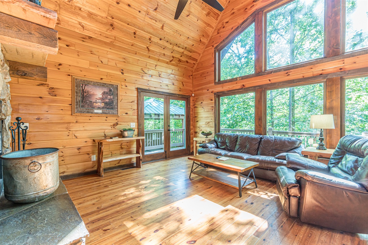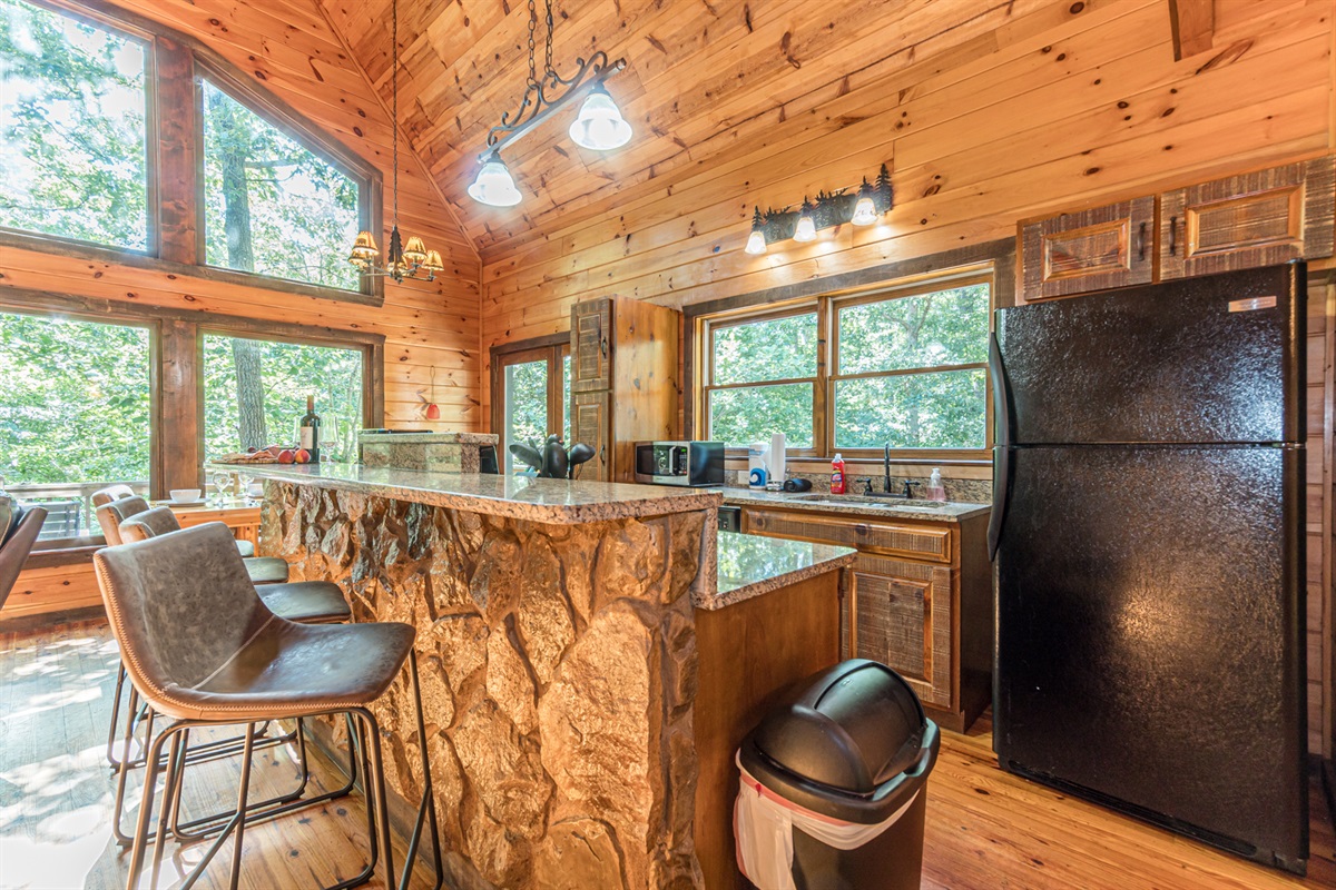 Nestled in a forest of oak trees, this 4 bed, 3 1/2 bath luxury cabin has all the comforts of home in a lush rustic setting. You’ll find that the design is perfect for a romantic getaway or family retreat, with its large cozy rock fireplace that extends to the cathedral ceilings. Oak Hill is stocked with a family playhouse with a full-size slate pool table and 4 player Simpson’s arcade game in the game room and bunks.